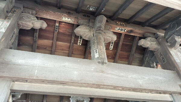 中央(写真左奥)の主柱は側面に大小の象鼻が付き、組物を介して棟木を受けています。