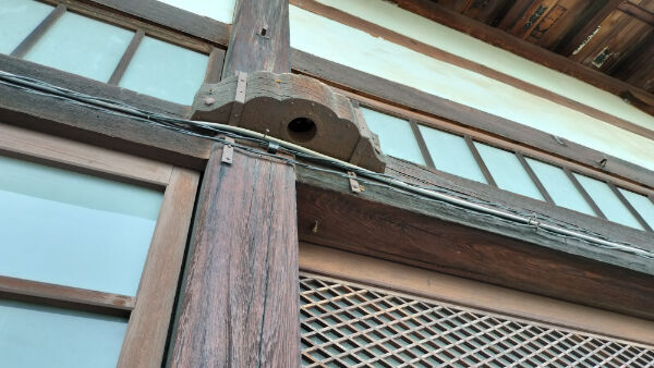 戸は引き戸ですが、左右の柱には軸受けの藁座がついており、当初は桟唐戸などの開き戸がついていたと思われます。