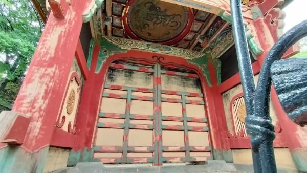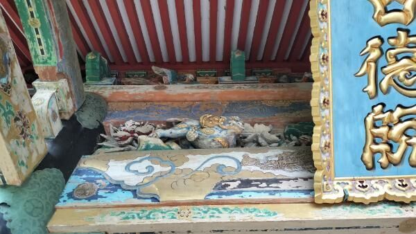 虹梁には牡丹唐草や神獣が描かれ、中備えは極彩色の平三斗。