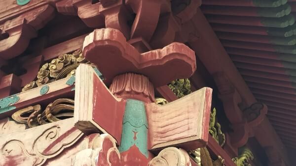 柱は円柱で、上端に逆蓮が彫られています。柱上の台輪には禅宗様木鼻。虹梁の位置には銅板の飾り金具がつき、角ばった形状の木鼻がついています。