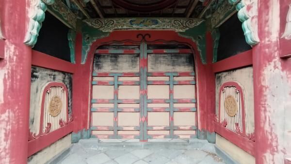 内部には桟唐戸が設けられています。桟唐戸の外側には、火灯状曲線の枠が設けられています。