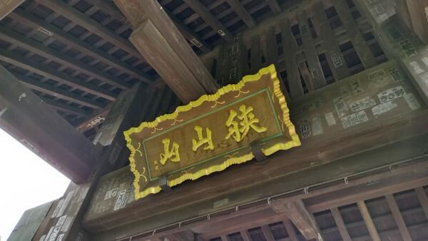 主柱は角柱が使われ、太い冠木がわたされています。冠木の扁額は山号「狭山山」。