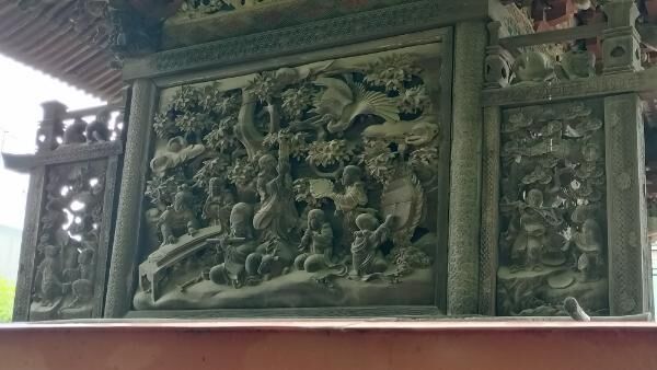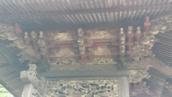 破風板の奥の妻飾りには虹梁があり、その上下にも彫刻が入っています。