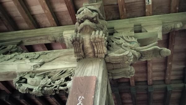 向かって右の向拝柱。正面に唐獅子、側面に獏の木鼻がついています。