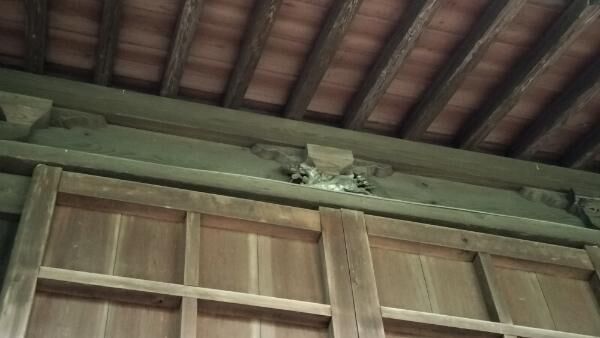 海老虹梁は向拝の虹梁の高さから出て、母屋の頭貫の少し下に取りついています。向拝側には牡丹の意匠の持ち送りがついています。