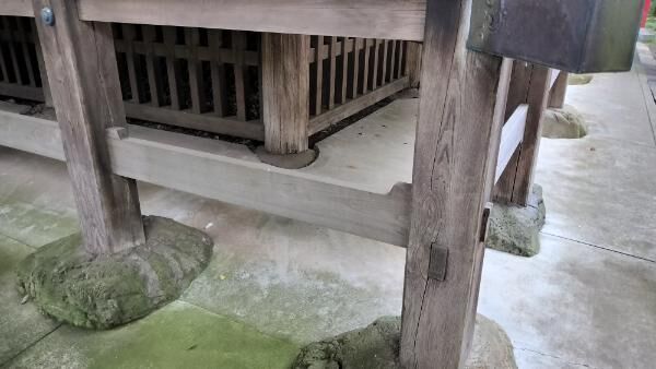 主柱の前後に低い控柱を立て、貫でつないでいます。両部鳥居のような構造。