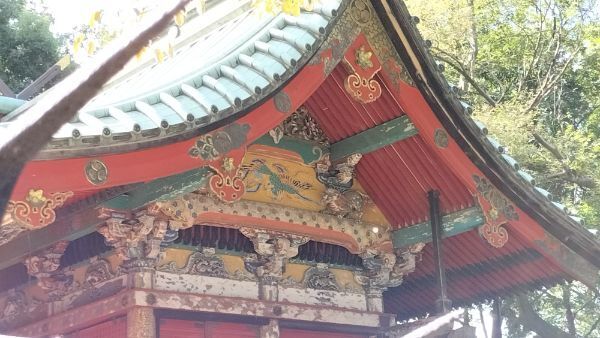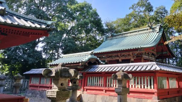境内は喜多院の南側に隣接し、社殿はいずれも1640年の再建時のものです。社殿5棟と鳥居1基が国の重要文化財に指定され、とくに本殿は極彩色の彫刻で彩られたきらびやかな建築となっています。