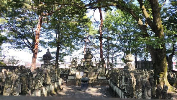 山門をくぐって進むと、参道右手に五百羅漢尊が南面しています。入場して全貌を見るには拝観料が必要ですが、柵の外からでも一部を見ることができます。