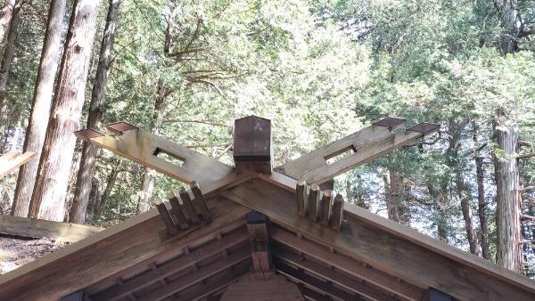 破風板は千木と一体の材で成形されていて、左右の破風板が拝みで交差し、千木部分が屋根をやぶって上へ突き出しています。